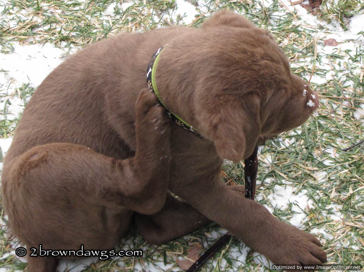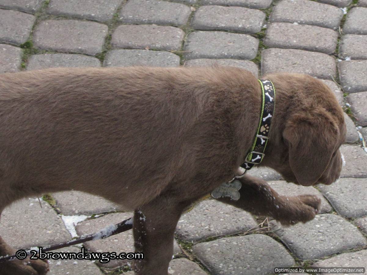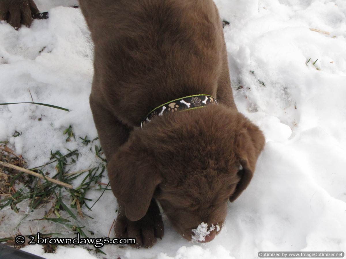Is there anything cuter than dogs with snow on their noses? LOL I love these pics and I think Freighter’s new collar is very handsome – goes well with his coloring too! His retrieving instincts are strong right from the start – you’ve got a real winning puppy there! 🙂