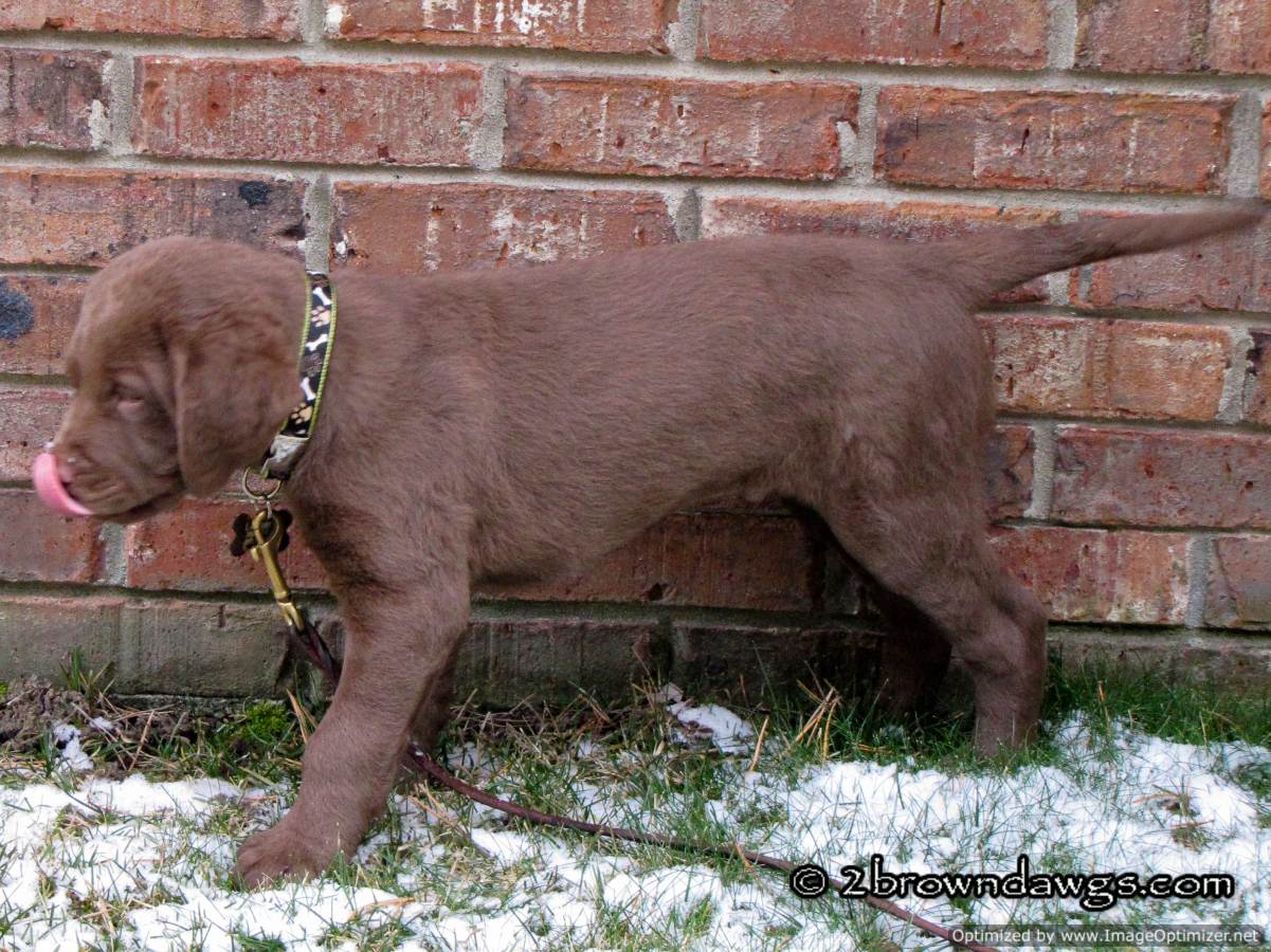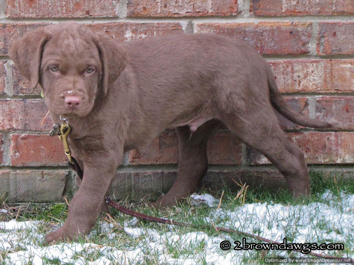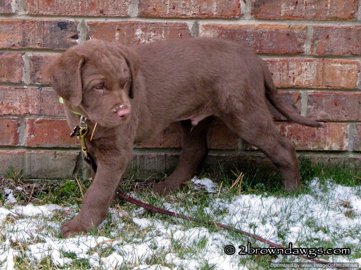 Freighter is a real sweetie. He loves to spend time with people. He already loves to retrieve and will bring his toy right back, (which is something neither Thunder or Storm did at this age and we hope he continues to do). He is also very smart, (which with a Chessie can be kind of scary :lol:). He is curious about the 2 big brown dawgs that live here, but hasn’t tried to be in their faces.