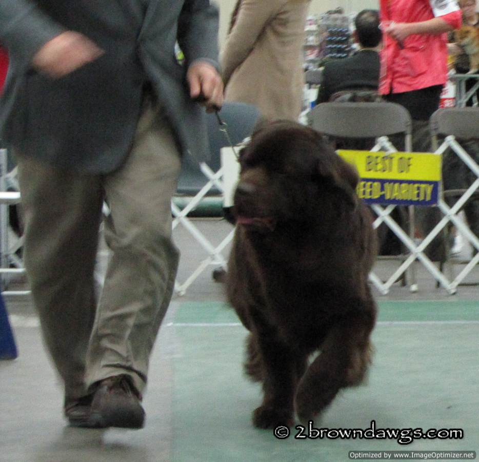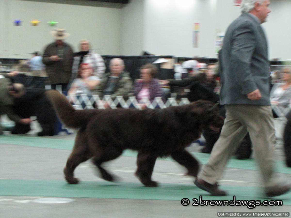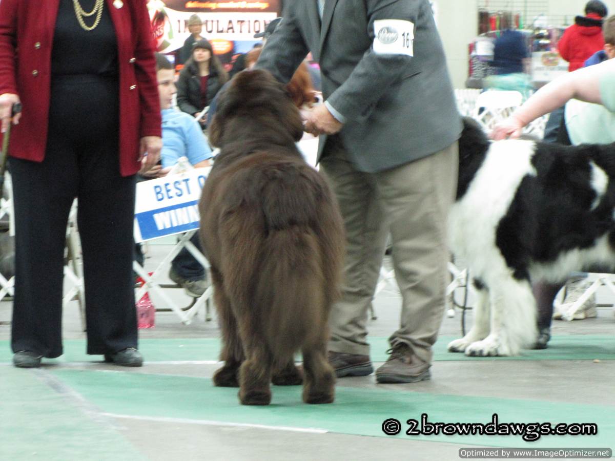This year, not only did we go to support the Chessies, but there was an additional draw because Leroy of My Brown Newfies was making his debut as a special. The Newfs were scheduled to show at the same time as the Chessies, but due to a judge change, the Chessie time was pushed back so I was free to go over and check out the Newfs. Leroy did great but there were a lot of Newf specials and unfortunately he did not get a ribbon. 🙁
