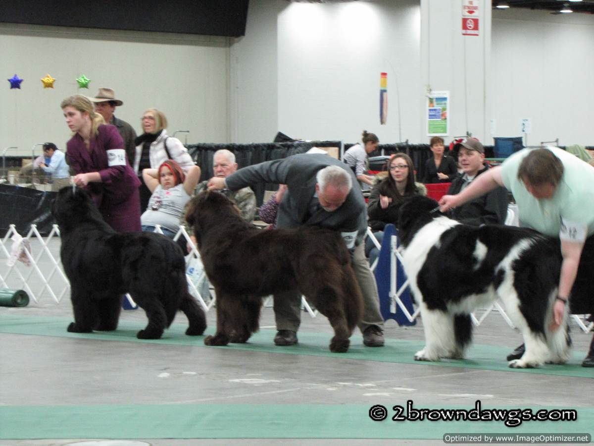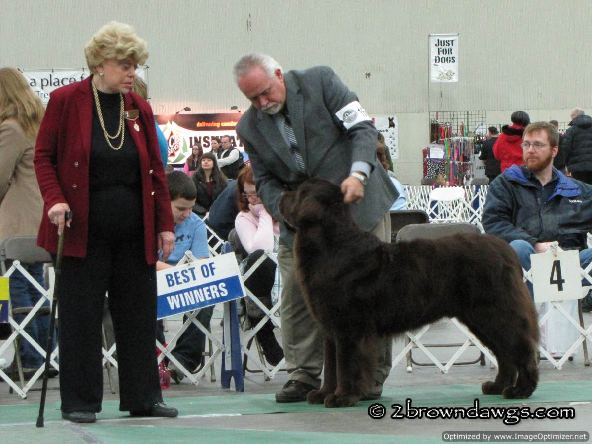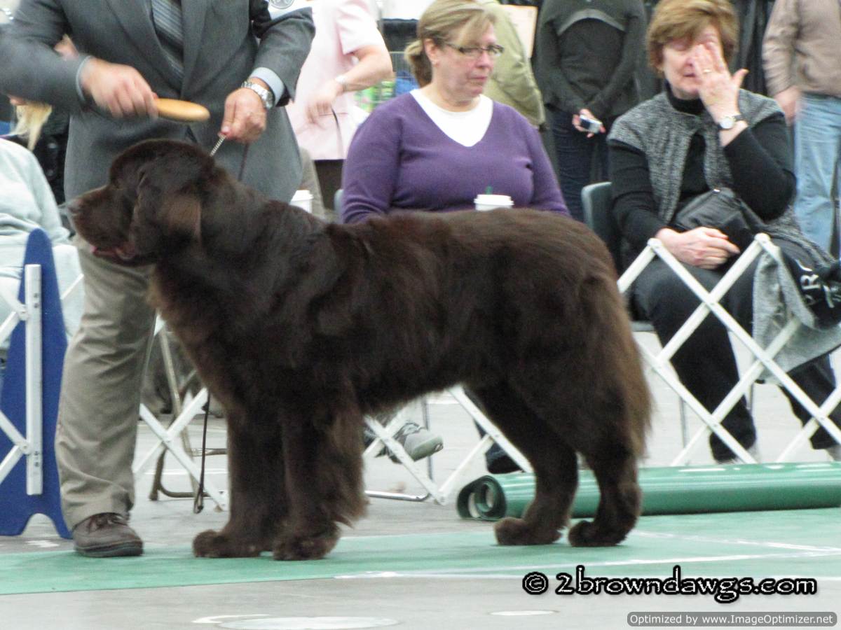 This year, not only did we go to support the Chessies, but there was an additional draw because Leroy of My Brown Newfies was making his debut as a special. The Newfs were scheduled to show at the same time as the Chessies, but due to a judge change, the Chessie time was pushed back so I was free to go over and check out the Newfs. Leroy did great but there were a lot of Newf specials and unfortunately he did not get a ribbon. 🙁