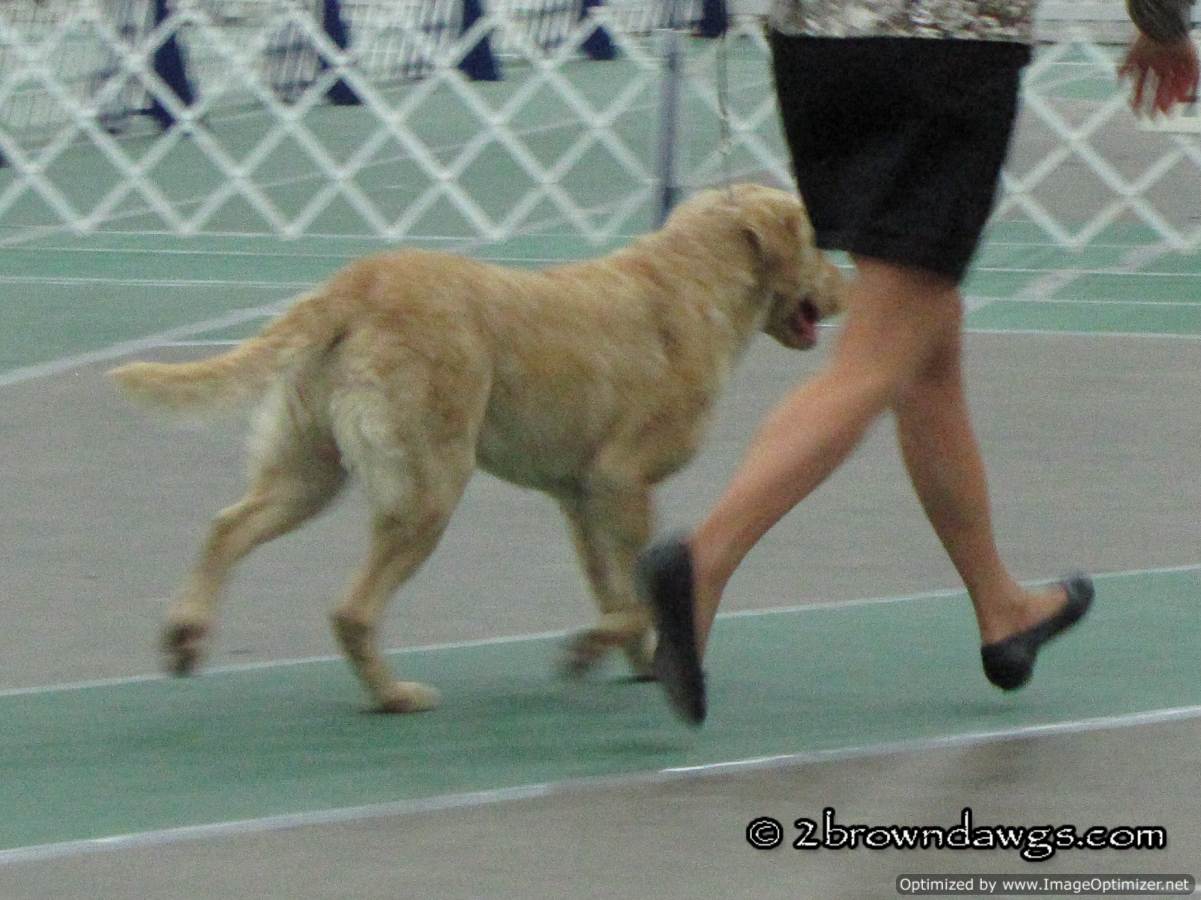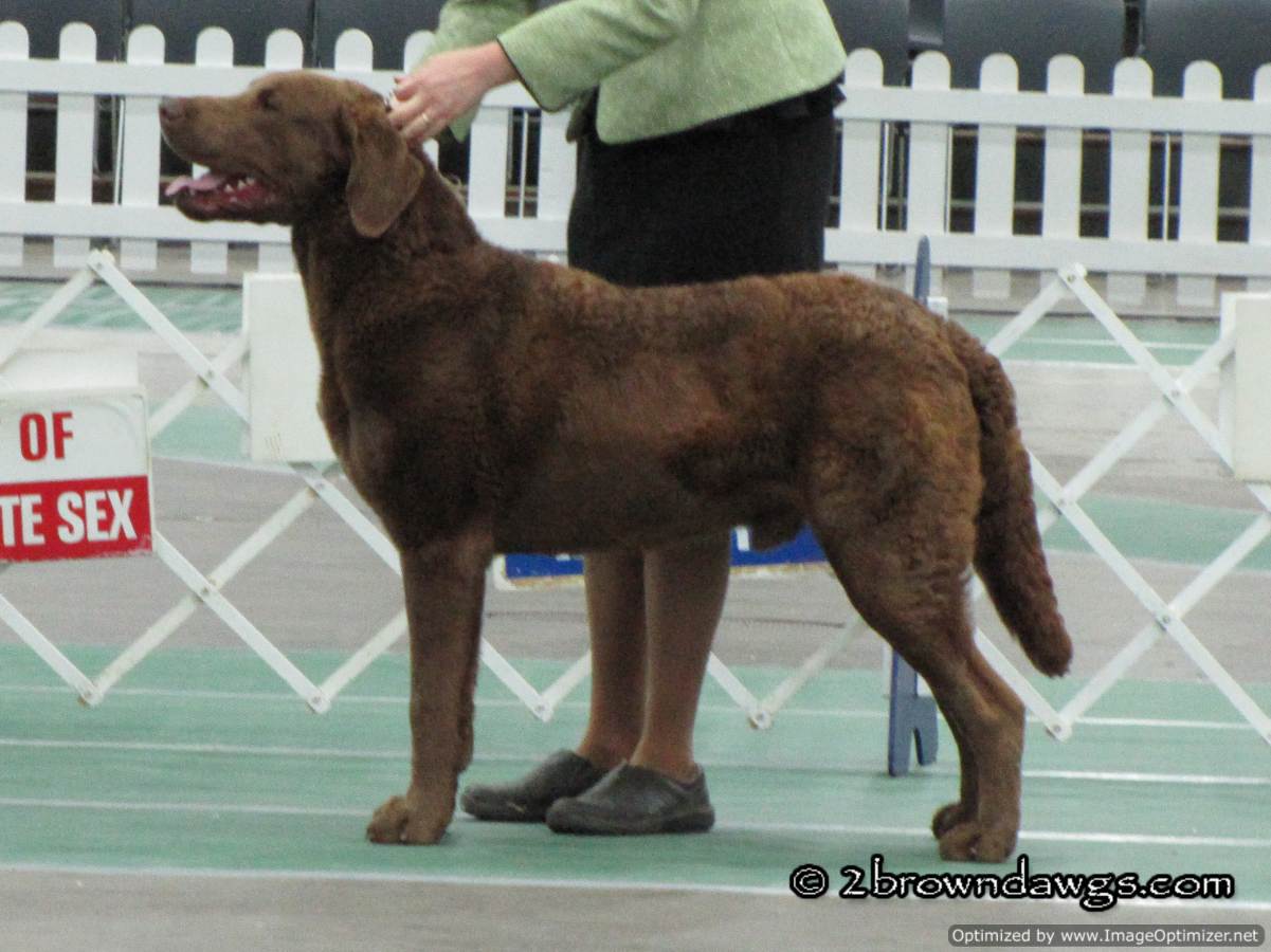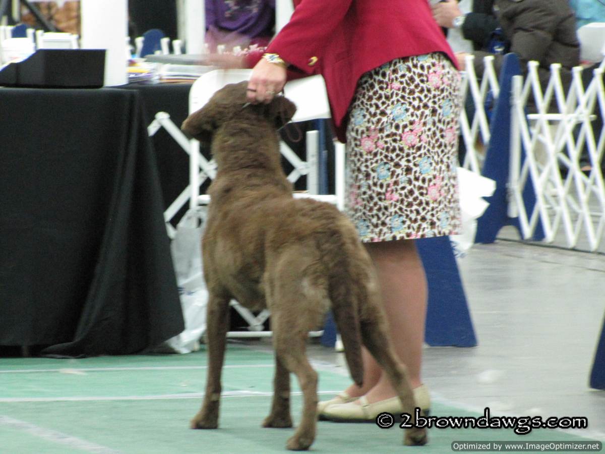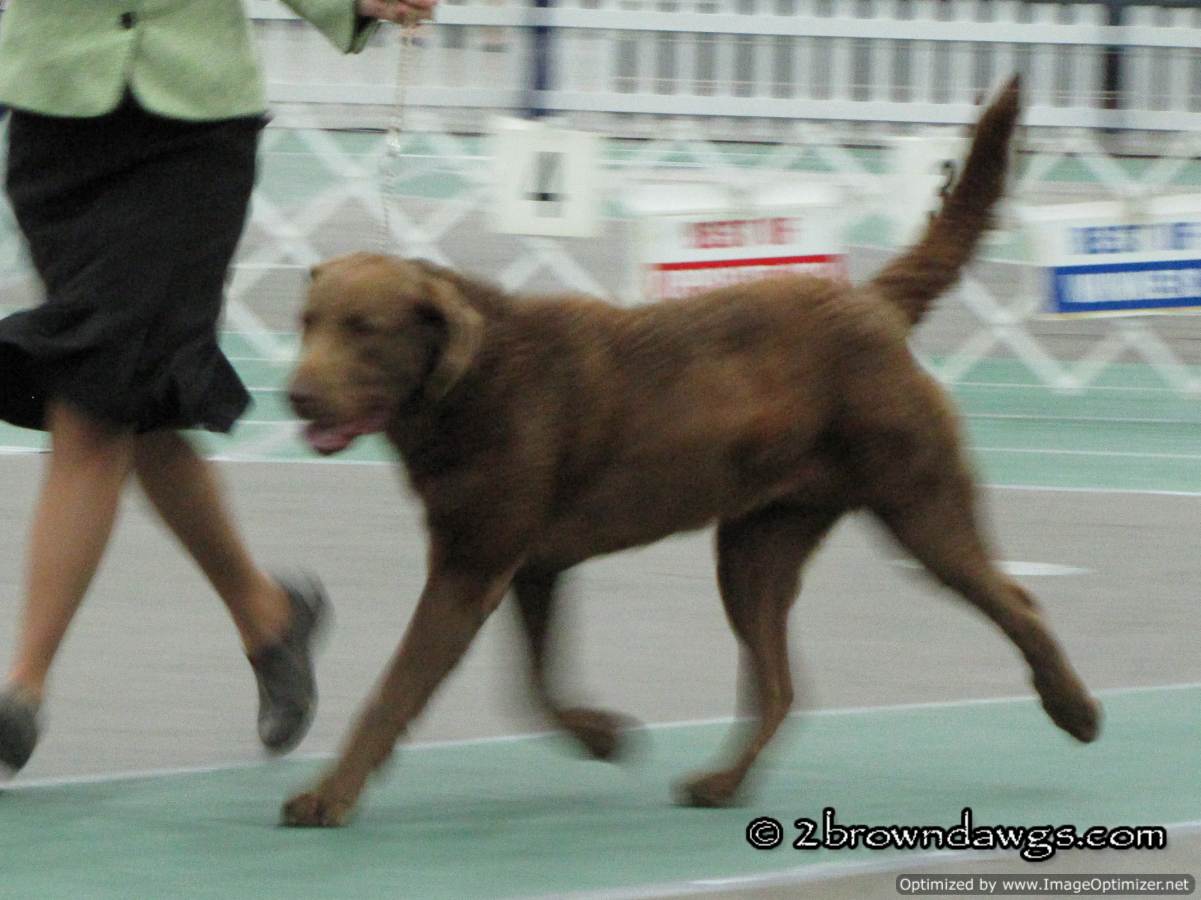 We left our house early because the Puppy/Veteran Sweeps for the Chessies were scheduled to start at 8:45 am. Sweeps were on time, but due to a judge change, the rest of the Chessies did not show until after 11 am. There were only a few dogs entered in sweeps so we had a nice big gap of time. It actually worked out because not only did I have time to meet Leroy and watch him show, (more on that here), but we also had some time to shop at the various vendors. Our mission: something for destructo pup to chew. More on that another time. Unfortunately, we could not stay at the show the entire day because we have Freighter at home and he cannot last hours and hours without a potty break. We watched the Chessies and then skedaddled. Unfortunately, we were a little late for Freighter and he was not pleased. Poor guy.