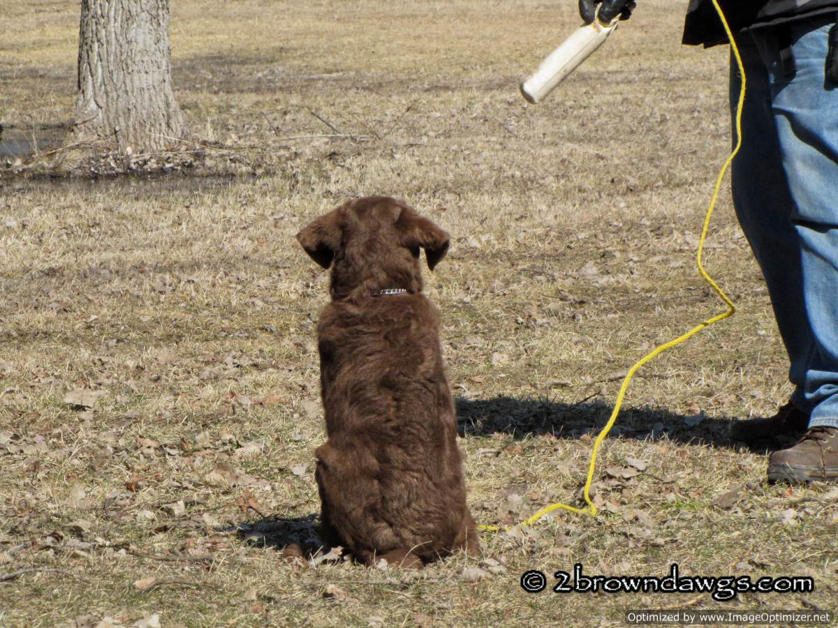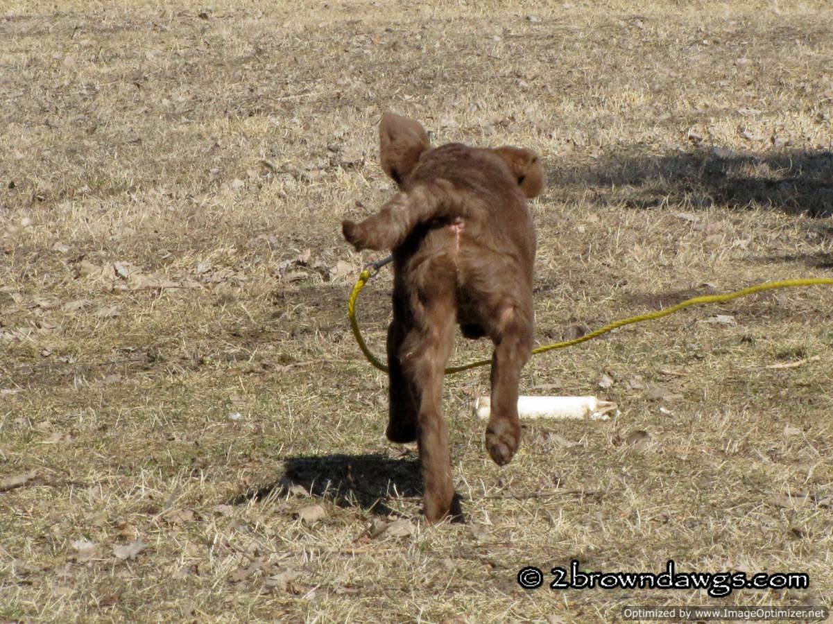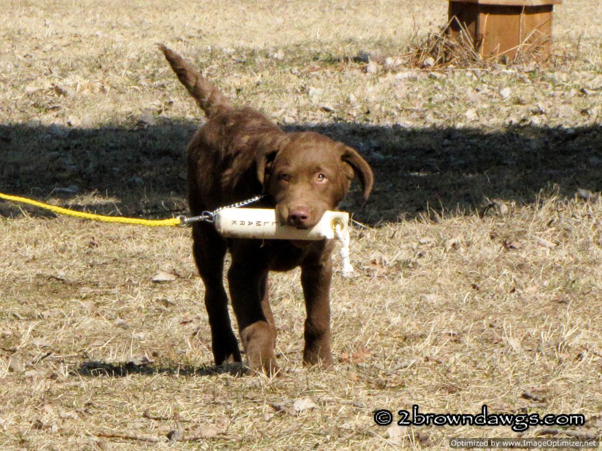 Freighter is on a check cord. That is to keep him from picking up the bumper and running away with it. You can use the check cord to gently reel the pup in should he go in the opposite direction with the bumper. The trainer keeps the check cord in his hand at all times. Freighter has sit down pretty well so the trainer can now move away a bit to toss the bumper. So far Freighter has nice drive to the bumper. It is coming back with it that his difficult for him in that environment (too many smells/distractions). We are using treats to speed up his return.