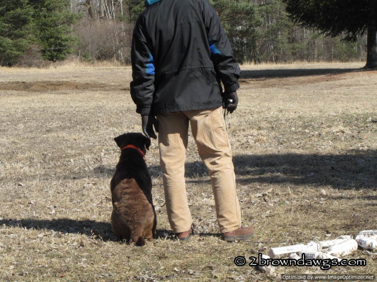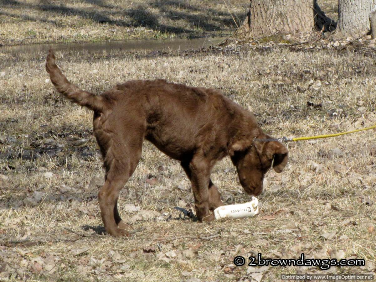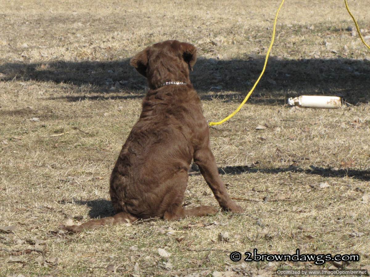 Freighter is on a check cord. That is to keep him from picking up the bumper and running away with it. You can use the check cord to gently reel the pup in should he go in the opposite direction with the bumper. The trainer keeps the check cord in his hand at all times. Freighter has sit down pretty well so the trainer can now move away a bit to toss the bumper. So far Freighter has nice drive to the bumper. It is coming back with it that his difficult for him in that environment (too many smells/distractions). We are using treats to speed up his return.