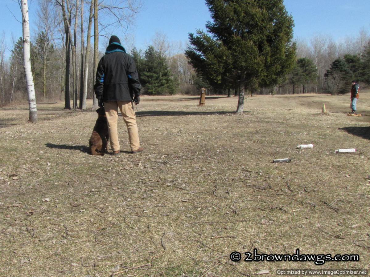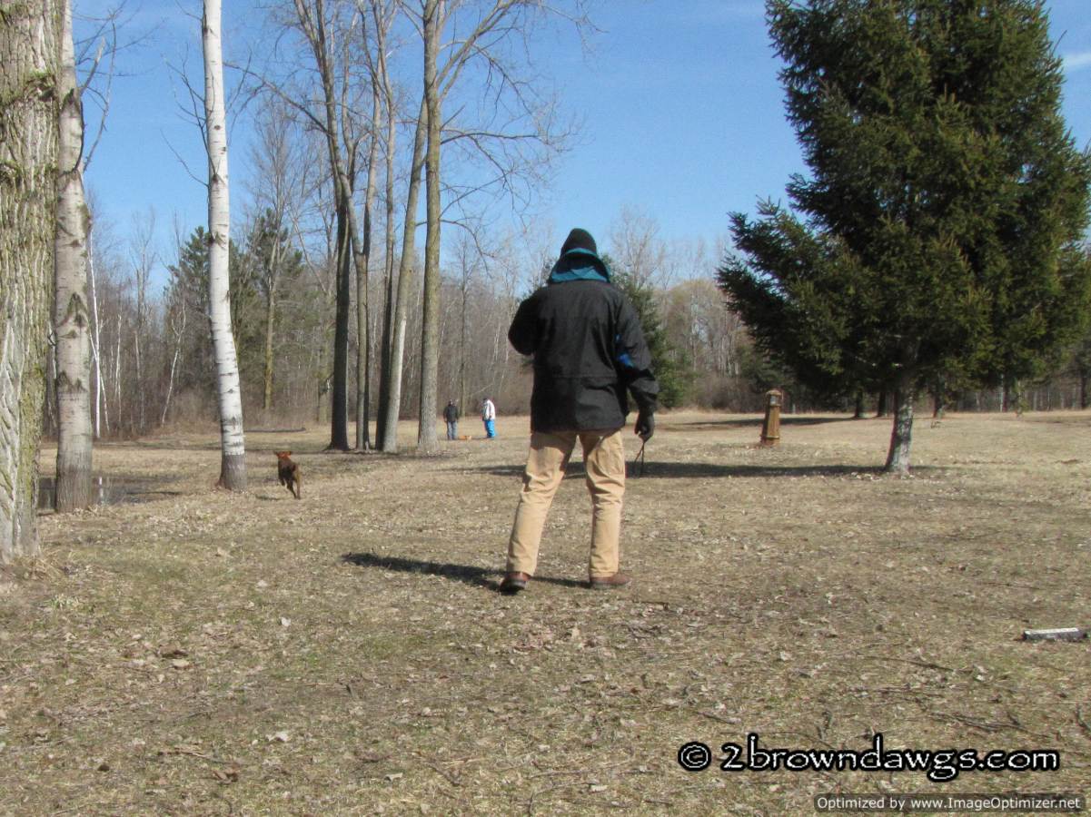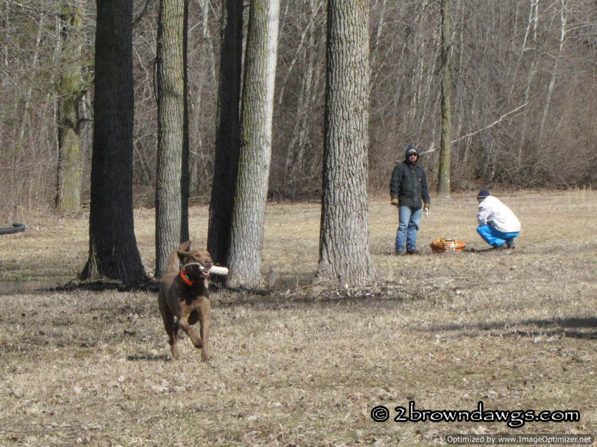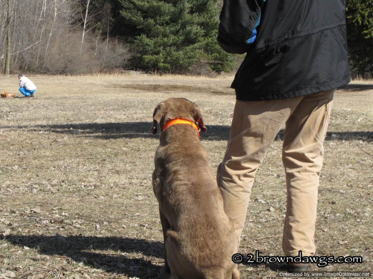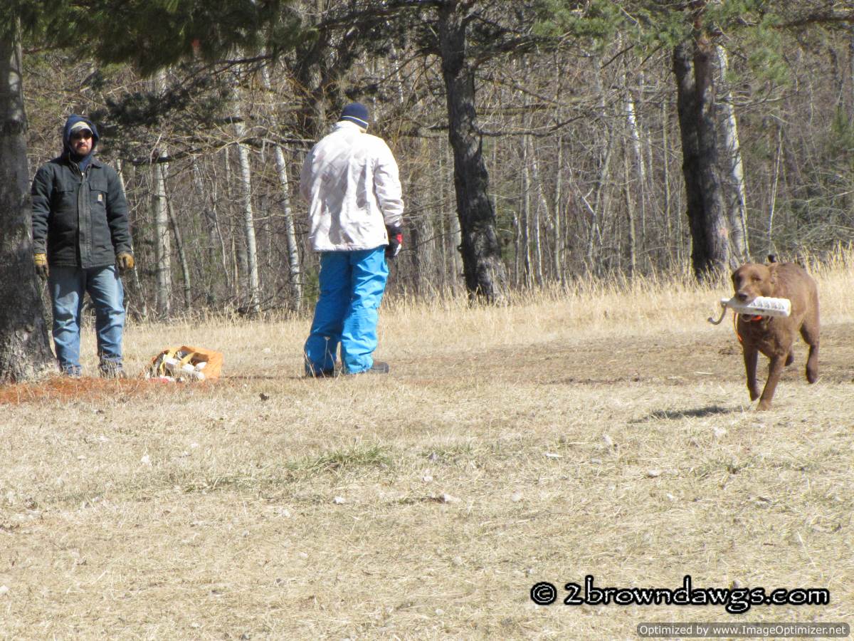 It was sunny, but windy for Saturday’s training. The wind made it feel colder than the temperature read on the thermometer. I put on my rain pants and rain coat just to block the wind. A nice sized group turned out and since there were three bird boys, the dogs ran triples. Hooray! Our dogs need triples badly. Considering that they have not run many multiple marks over the winter, they did very well. It got a little tougher for them the more they ran in the field, but on the whole they did very well.