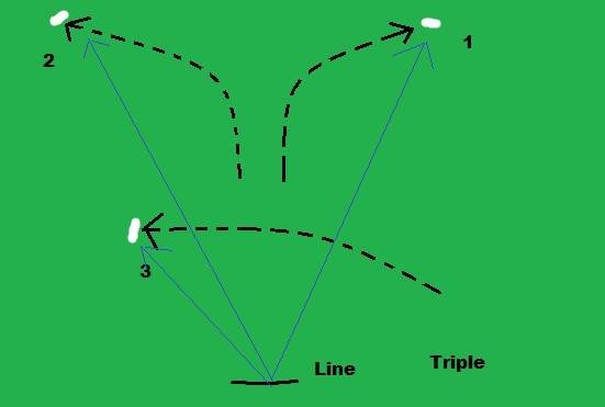 I only drew one diagram (not to scale of course) just to give an idea of the kinds of triples the dogs ran. The numbers indicate the order the bumpers were thrown, but the dogs could pick them up in any order.