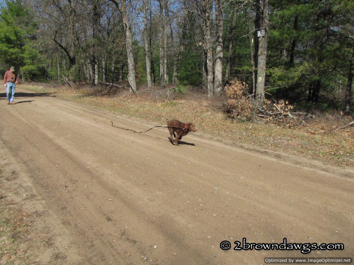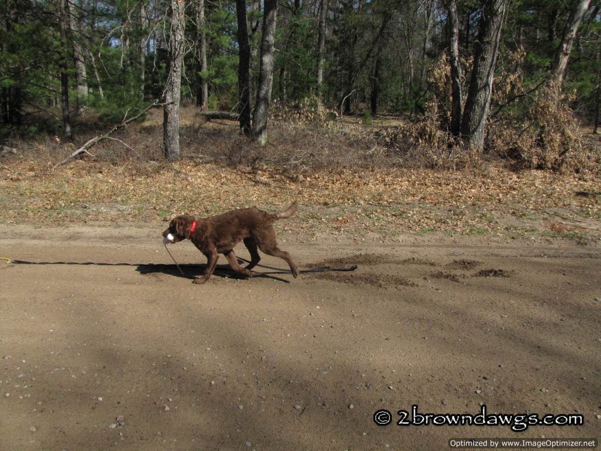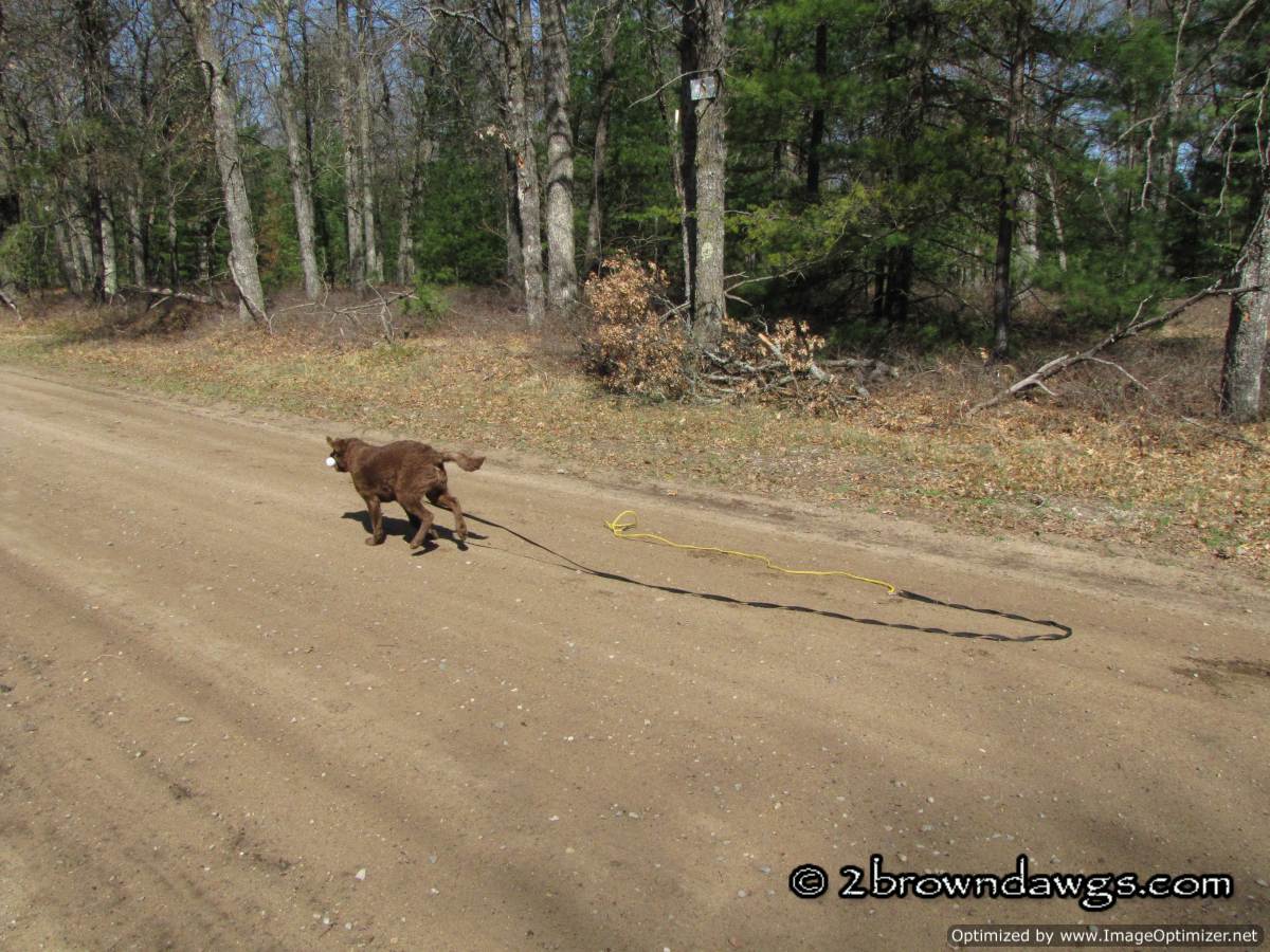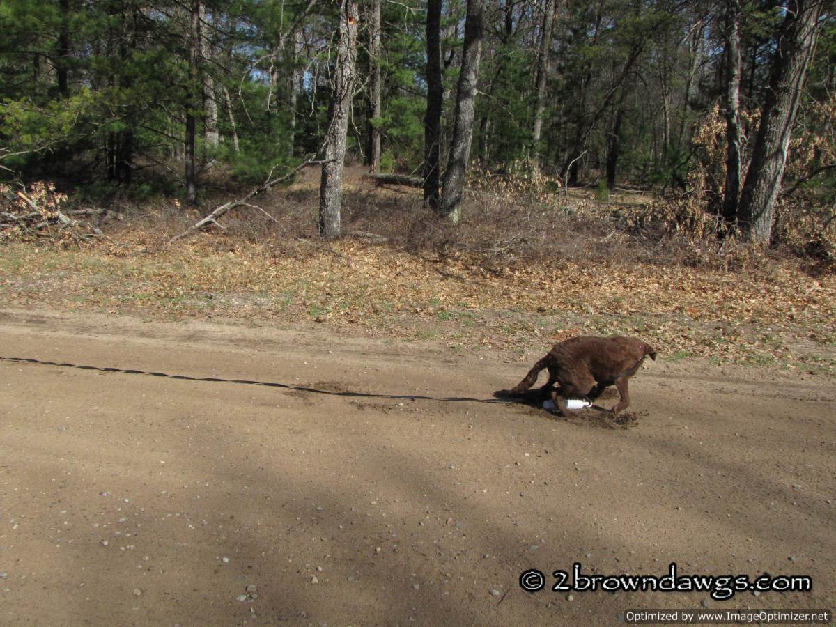 Since we did not train on Saturday, we made sure to do some training in on Sunday. It was another bright and sunny day, but very windy. We have been working on getting Freighter super excited about retrieving bumpers. At his age, there are no rules except have fun. We want to see him move quickly to the bumper, and hopefully bring it straight back, but the return is not as important as the going out. He has been doing well getting to the bumper, but sometimes takes detours on the way back. We decided to throw marks on a back road hoping that the visual of the road and less tempting smells, would help him come straight back. I was a bit nervous because on one side there is nothing but forest and Freighter’s recall although coming along, is not perfect. We put an extra check cord on just in case.