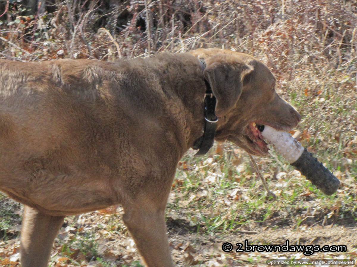 I also took some video of three of his marks. For the first mark I tossed a teal training dummy in the cover. Since it was a teal it was quite small so Thunder had to hunt for it. He stayed in the area of the fall and found it. For the next mark I threw a bumper on the opposite side of the road. No problem, Thunder marked it fairly well. He went a bit long, but that is OK. Better long than short. The third mark I threw in the cover on the same side of the road that I threw the teal training dummy, but a bit farther back. By this time the wind was really swirling, which you may be able to see and hear on the video. Thunder was headed for the bumper, but then caught the scent of the area he had picked up the teal and hunted that area a bit. Every time you throw multiple marks to an area, it can make it a bit harder for the dog because the area will be salted with scent. In a test if the dog is the say, the 30th dog to run, there may be a lot of scent from ducks thrown for dogs that have already run. In training, you try to show something similar to the dog so they have the experience. You might be able to see Thunder using his nose to try to catch the scent of the bumper. Of course a bumper does not have the strong scent a duck has which makes it a bit harder for the dog to use his nose. Finally Thunder slows down a bit, scents and sees the bumper. Good boy! (My “hey, hey, hey”, which is used to get the dog’s attention, is quite loud because the wind was blowing toward me and I needed it to carry to the dog. :))