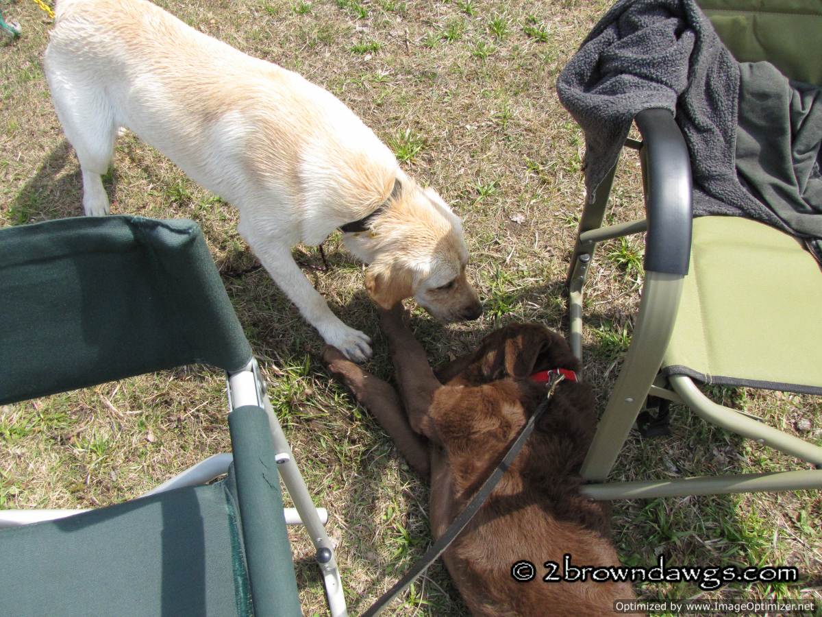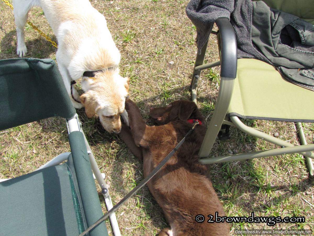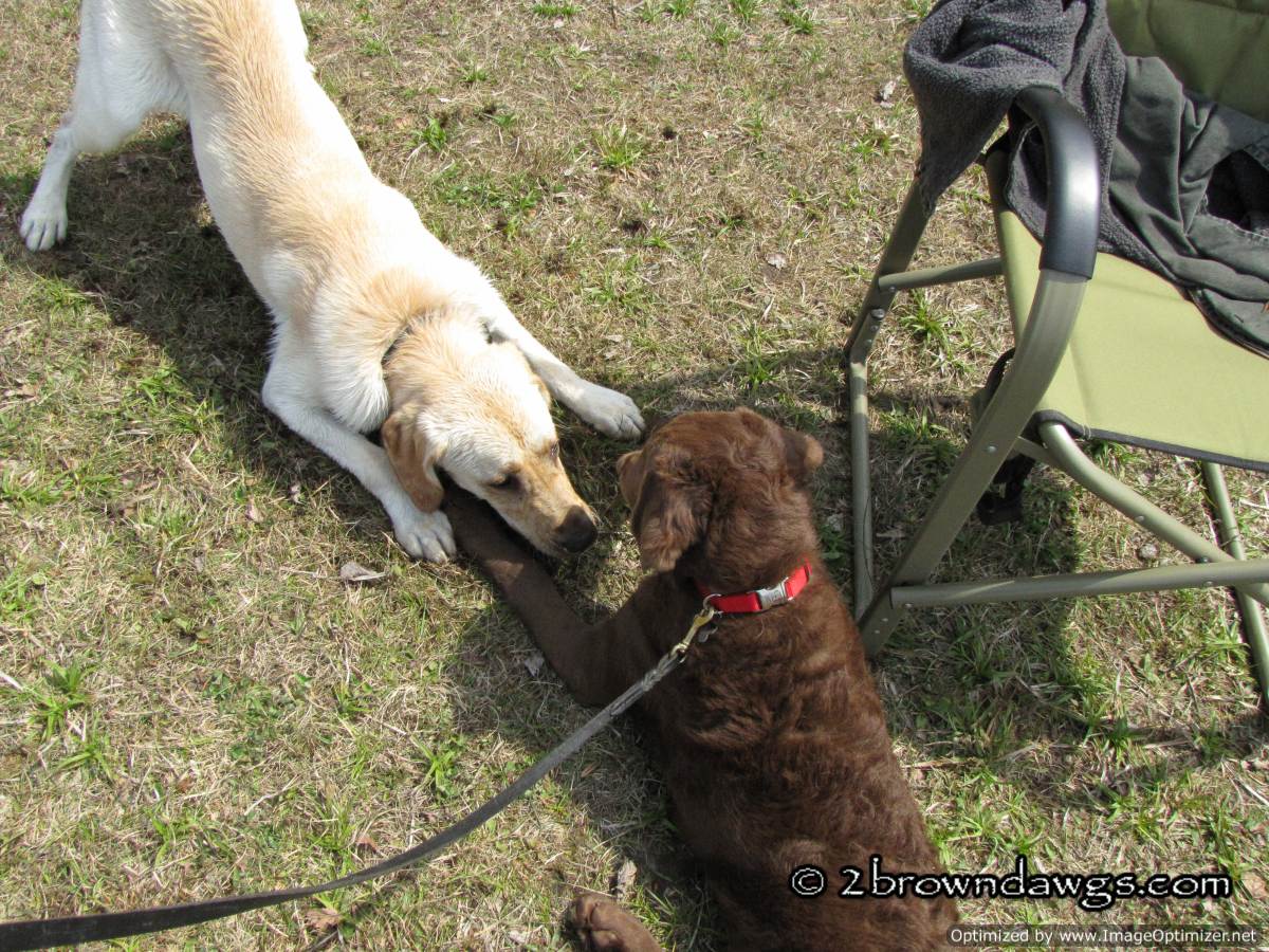 I guess I can’t be completely wordless today. These are pictures of Freighter and his new pal Strider. Strider is just over a year old. He was on a tie out to dry off after running a water blind and I had Freighter on lead. They both stretched as far as they could so that they could meet.