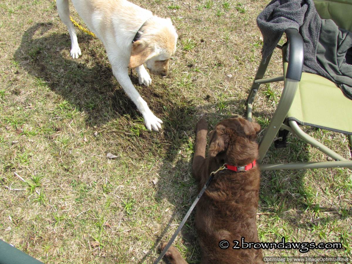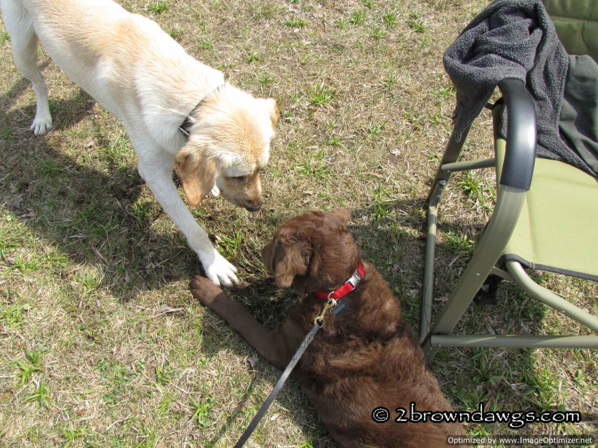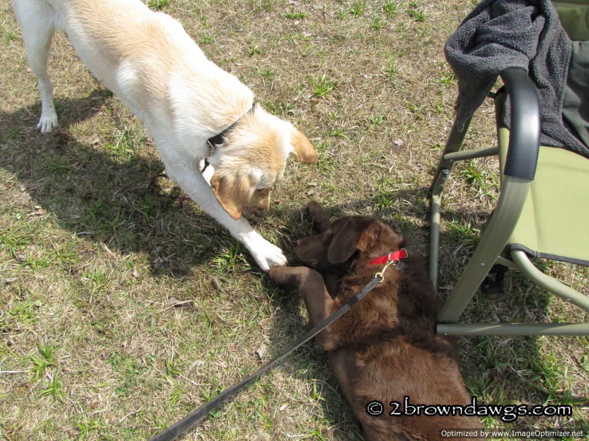 I guess I can’t be completely wordless today. These are pictures of Freighter and his new pal Strider. Strider is just over a year old. He was on a tie out to dry off after running a water blind and I had Freighter on lead. They both stretched as far as they could so that they could meet.