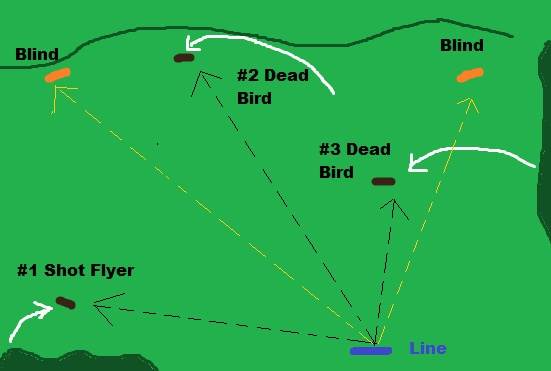 As far as lining, others may have done it differently, but Thunder and Storm’s handler lined them center to the field because these marks went off left, middle and then right in succession, (with maybe 4-5 seconds in between). The throwers sounded a duck call and then they shot the flyer or shot a popper and launched the dead bird. The dogs needed to see all of marks fall and you are not allowed to talk to your dog to realign them until the judge releases you. Our dogs have a lot of hunting experience so they are used to swinging with their handler’s body movement as he swings the gun to “shoot” the marks. Also, the handler’s leg position can help an advanced dog swing to watch. We usually do not have issues with our dogs seeing the marks provided they are looking out. Believe me they know where the birds are normally. 😉