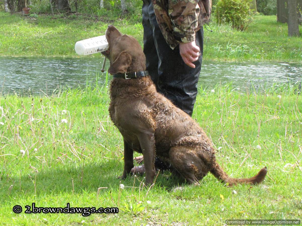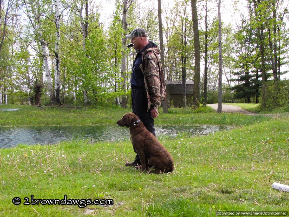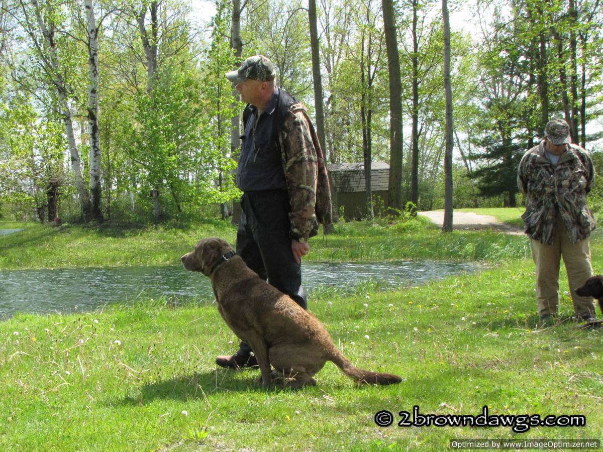 Continuing our training from last Saturday, the Master dogs also did a long water mark. It was about 20 yards on land and then 100 yards across the pond, so approximately 120 yards in total. Not only was it a long swim into the wind, but the dogs had to skirt the edge of the island which can sometimes throw them off.