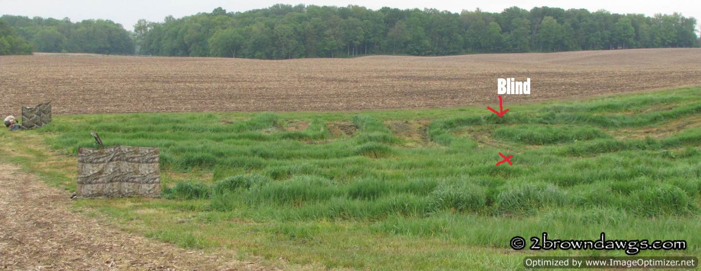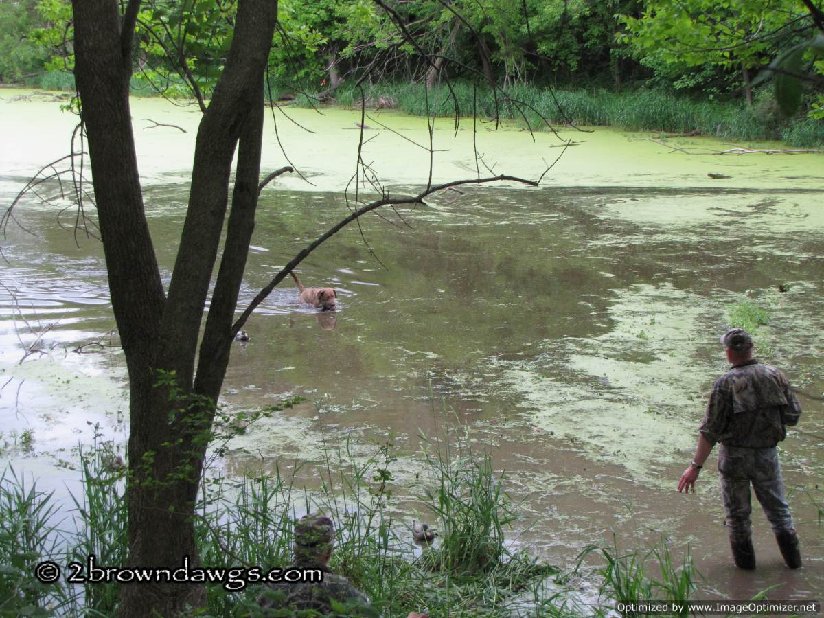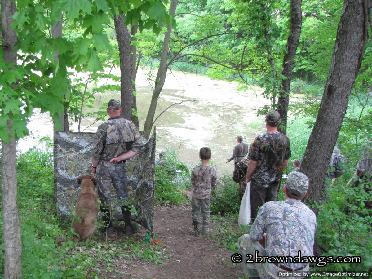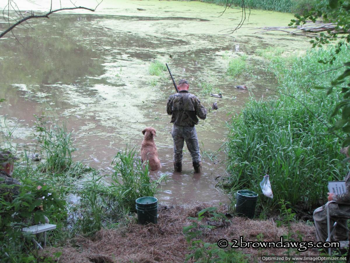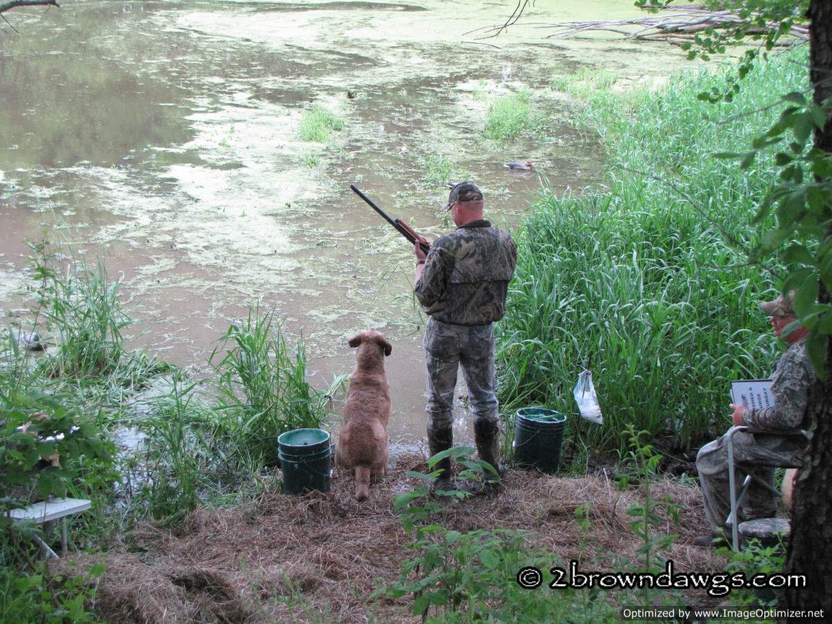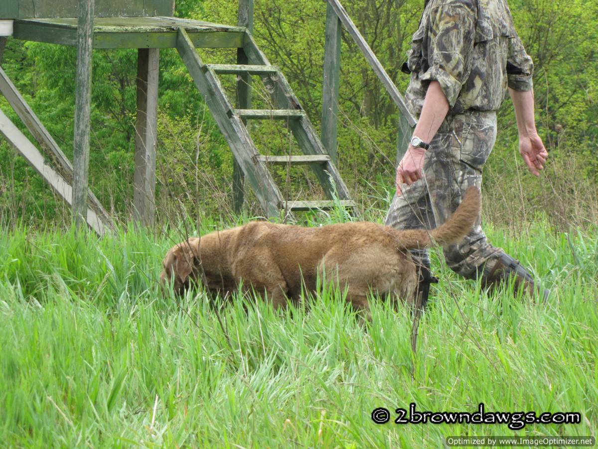 Thunder was sent to pick up mark #3 (go bird) first. He went straight to the area and hunted in the tall grass, but did not come up with the bird. He tried to play the wind and unfortunately got too far right of that bird. Once he did that he picked up the drag back scent (the path the dogs had been dragging the ducks back from the blind) and it was like a super highway that lead him right to that hot blind and he picked that bird up. An automatic DQ. It was ugly. A couple of other dogs did the same thing. The blind was kind of close, but not unreasonably so.