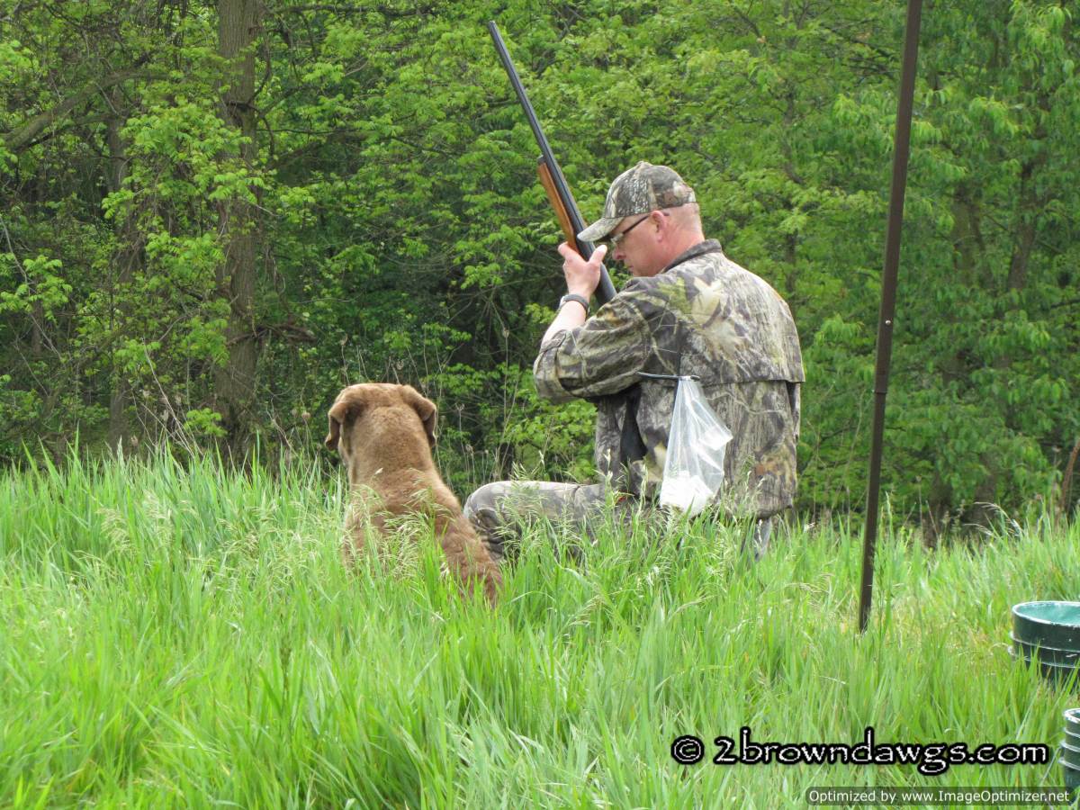 Thunder didn’t fare so well in his first Finished Test. We entered him because he had been doing so well in his training and we thought it would be a good opportunity to get him in the hunt test frame of mind. The test was far enough away that it required us to spend the night before in a hotel. Storm is still with the trainer so we only took Thunder and Freighter. I was a bit concerned how Freighter would do in the hotel, but he did great. He really takes most things in stride. He met a lot of new people hanging out at the test. It was great socialization for him.