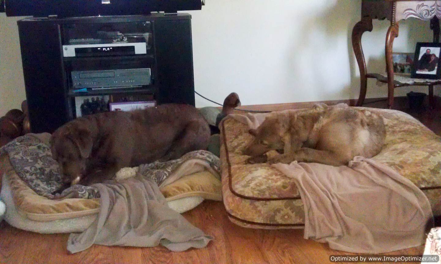 Freighter had a fun weekend with his Sis, his Mom, and his Grandmother. Cindy sent along this picture of Freighter and Sunny hanging out chewing their antlers.