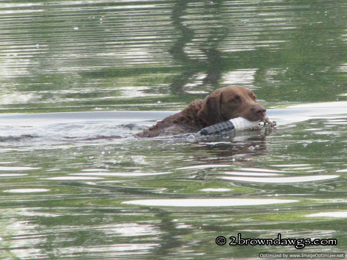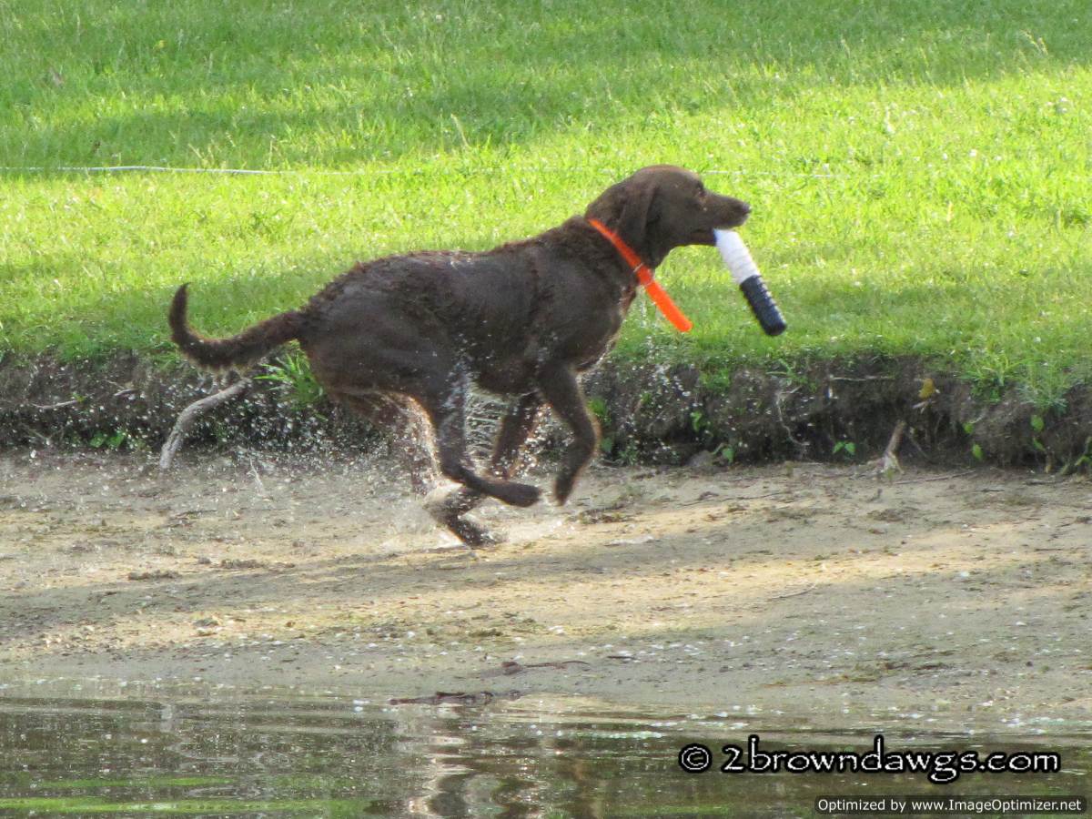 Next we ran Storm on the Blind, which was sort of under the arc of the Mark 2, (well as good as we could set it on this pond). I took some video of her running this blind. Toward the beginning of the video, you can see something white on the far bank. Storm was fixed on it, (not sure what it was, probably some trash someone left there). It was not the bumper, but she thought it was. She was convinced. Her handler had to change her mind and get her to swim in a slightly different direction to where the bumper was. It took a couple of casts, but Storm finally gave up on the white “something”. It was a good session. Sometimes when you are out training, you get help from things you hadn’t even planned on. 🙂
