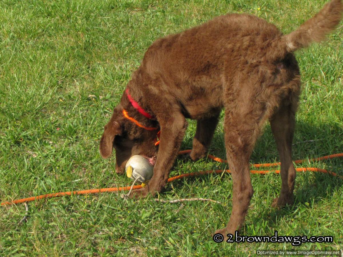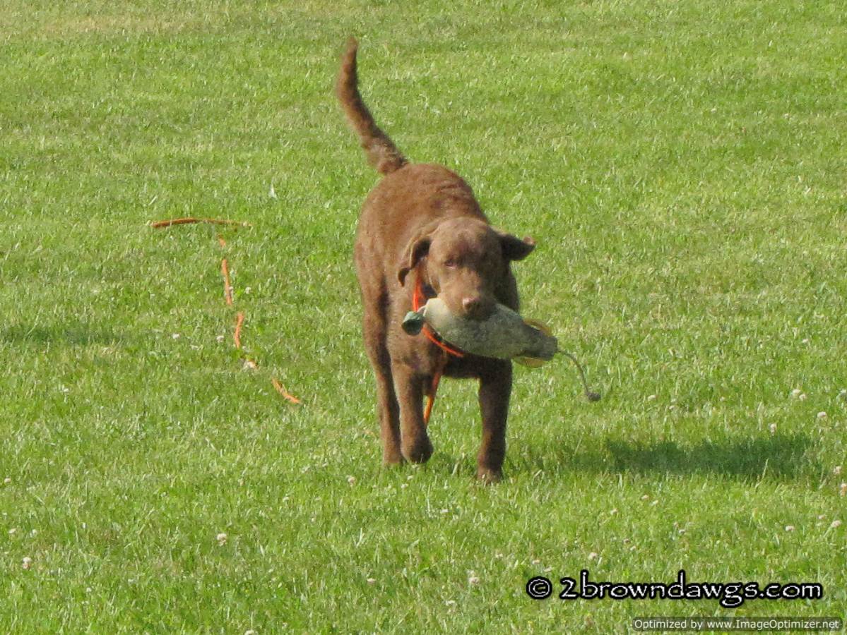 I agree Hsin-Yi that a lot of what you would like Honey to do would be easier if you had a retriever breed. 🙂 Some of what you describe is quite complex for a dog. We work on having the dog hold and then doing something else, say heeling next to us, watching marks fall, or giving other commands. But some of that is not done until they are well advanced in their retriever training. Even then some of the ability to multitask as you describe it can be easier to “train” depending on the dog’s ancestors. The ability to learn those tasks can in fact be genetic. You can’t teach drive and that is something we hope has been bred into our retrievers. (along with brains). Freighter is quick to the bumper, and will hold for the most part and that is mostly genetic because we have not started actual retriever training yet. The other thing that a retriever should be able to do is to take on unpleasant conditions to make the retrieve, especially if that has been reinforced with training. That can be something difficult to train in a non-retriever breed, (this is where drive or birdiness helps). And definitely we have to work on the dog bringing the thing back, especially Chessies it seems. They like to mess around…lol.