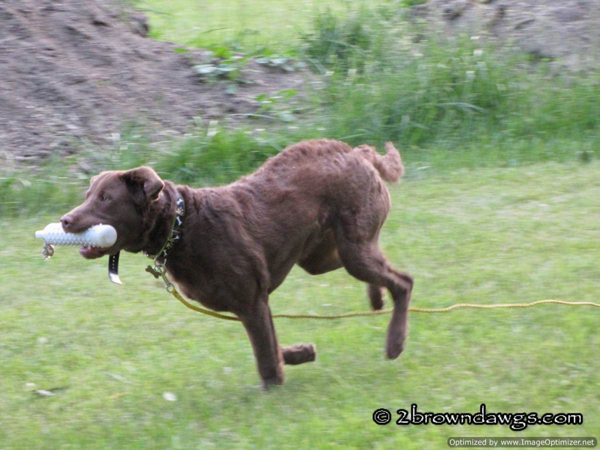 I am no trainer, but for Honey or any dog wanting to learn to hang on to the object that they are asked to retrieve, I don’t see why you could not try to teach a “hold” command. Start out with the dog by your side and tech “hold” separate before putting it with the retrieve. Reward when the dog holds whatever you have asked it to hold, a toy, a bumper, whatever. Then once that is solid, put it with the retrieve, but keep it short. Lengthen it little by little. Even at a retriever test, it is not uncommon to hear handlers telling their young dogs to “hold”, “hold’, “hold” on the return because the dog knows the command. The key is to start out short and keep it positive. (This is not exactly how Freighter will learn it, because his training will involve much more, but for fun retrieves it is one way to teach it.)