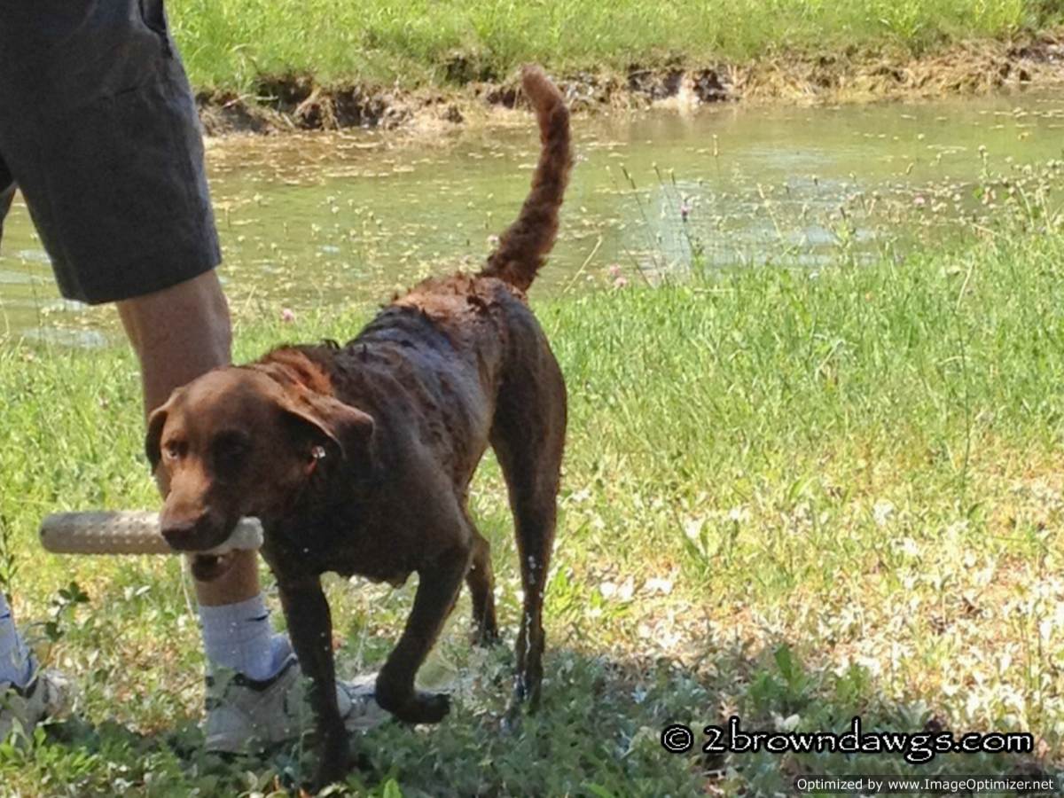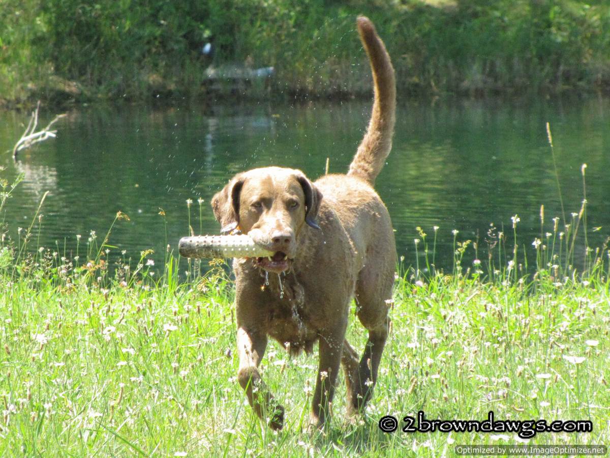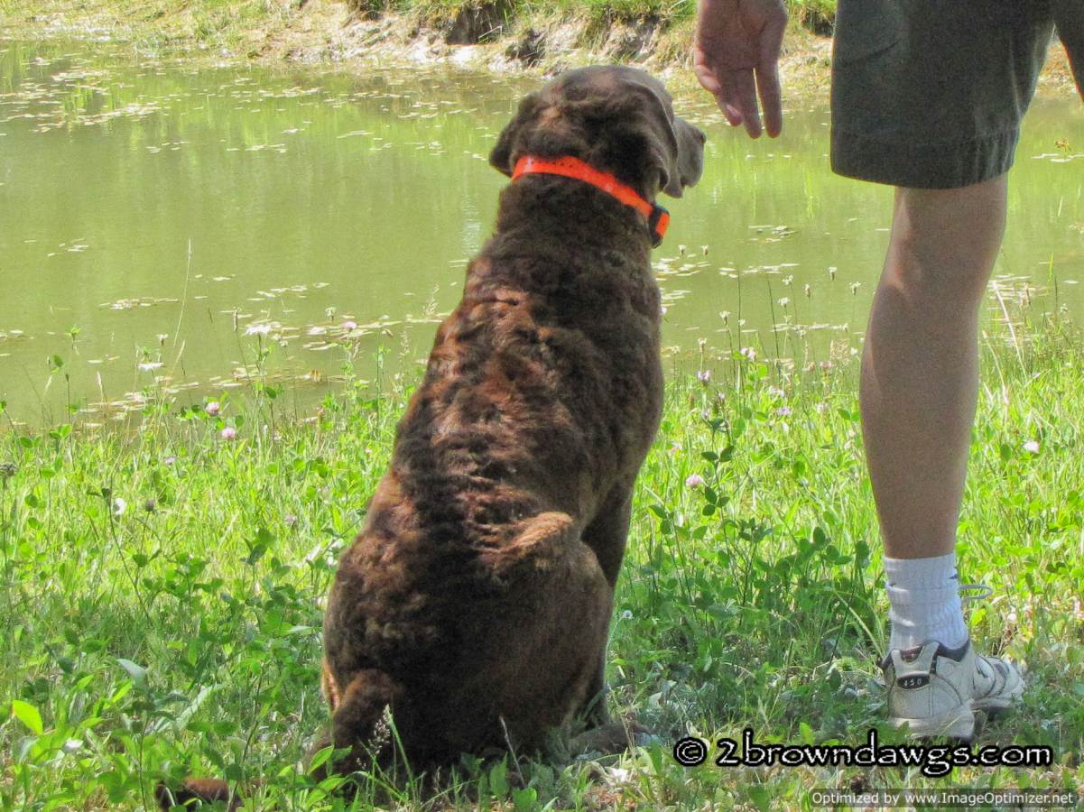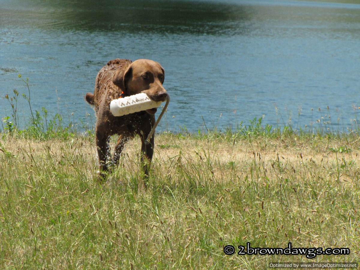 Last Saturday we had another hot day for training. Despite the warm temperatures a lot of people showed up to train. There were dogs at every level, from untrained dogs to dogs running the Master level. We were surprised to see some other Chessie owners that we know from our Chessie Club. There was only one gunner so Darrin set up a couple long water singles.