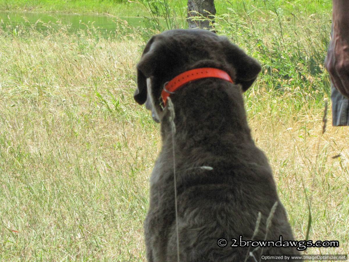 Again this was a challenge for Thunder because he doesn’t have a lot of opportunity to get these super long swims. At one point he got to where there is an opening to the other part of the pond and he winded some ducks. His nose went up and he seemed to be thinking duck? bumper? duck? bumper? He went for the bumper but when he got out of the pond, he over ran the bumper and had to be handled back to it.