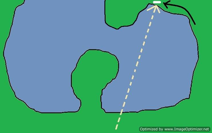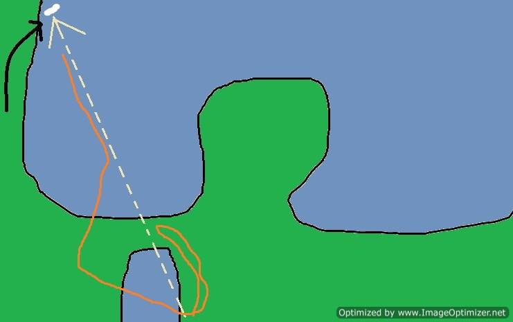 Thunder had a bit of trouble with this one. He has not had that much experience running these kinds of set ups. At first he wanted to cheat the bank and run to the large pond and start there. He was recalled and resent and he did what most inexperienced dogs do, he kind of squared up to the water. He got out to the mark, but with all of the messing around at the beginning he lost sight of the bumper and had to be handled at the end. The white line is the desired path. The next diagram shows Thunder’s path in orange.