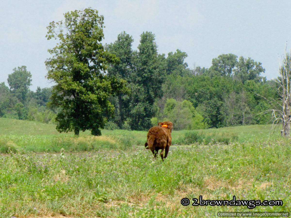 The training day last Sunday was a Club training day that was open to members and guests. It was set up as a land triple with a couple of blinds. The junior dogs started and ran the marks as three singles. It took forever to get through the junior dogs. The senior dogs ran the three marks as a double and a single and ran one or both blinds. They moved much faster, but by the time they got to the Master dogs it was late and it was hot. It was decided just to run the triple and even that was tough.