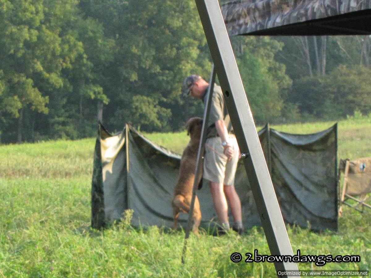 While waiting to run a hunt test, the dogs are supposed to wait behind a blind so they cannot see the test ahead of time. Sometimes it is just too hard not to sneak a peek.