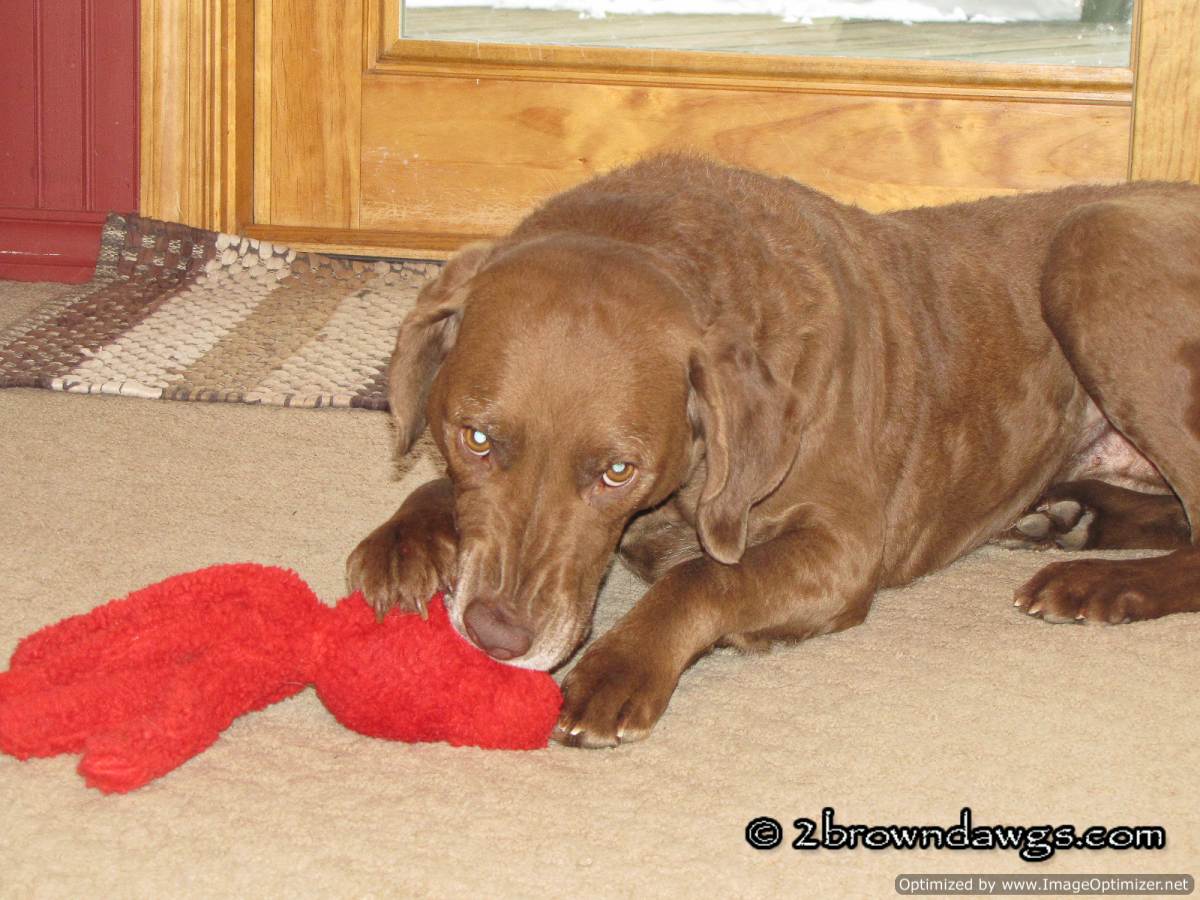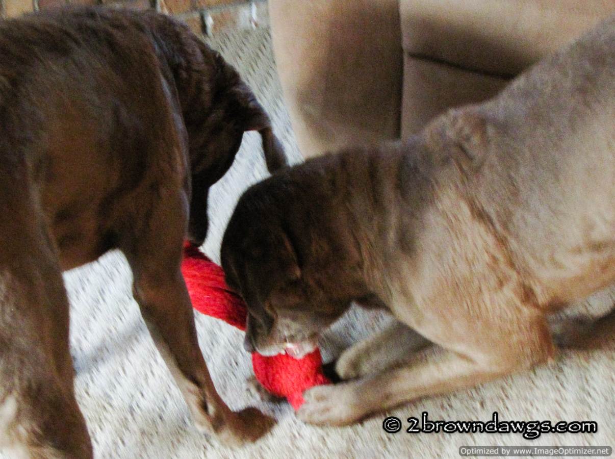 The brown dawgs also got some great stuff from their cousin Polly. They got some special treats and a Kong Wubba. It is a well established rule that Storm claims all Kongs for herself.