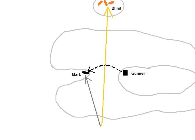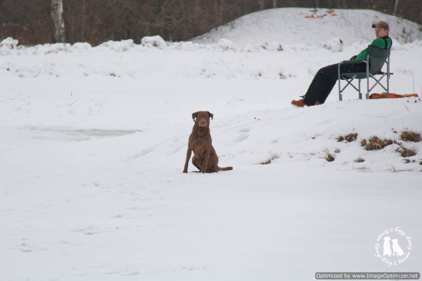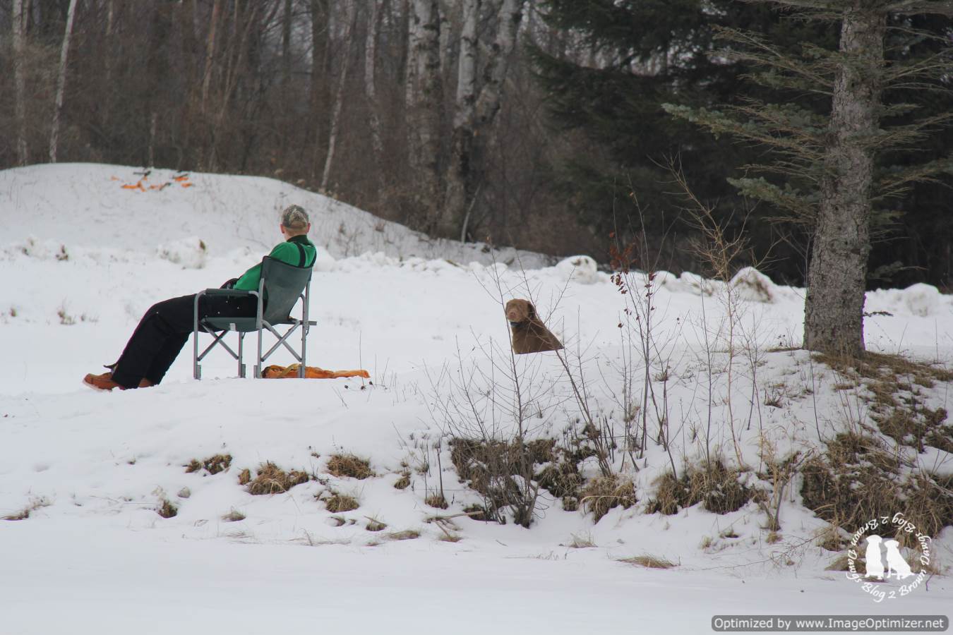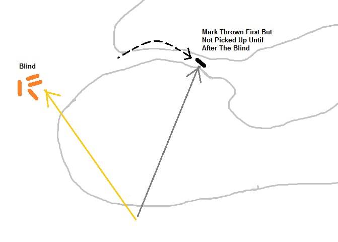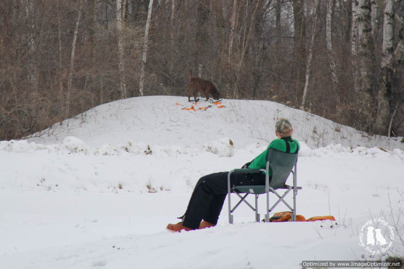 This is a higher level set-up which all the dogs training for Master tests ran. (The lower level dogs ran a modified version of this set-up.) The difficulty with this set-up is that the mark is fairly close to where the dog will be running the blind. We were running over a frozen pond and the blind was up on the opposite bank and back a bit from the edge. It can be hard for the handler to pull a dog off a mark and get them to pay attention to him/her since the dog’s preference is to retrieve the bumper they just watched to fall and that is visible in the field.
