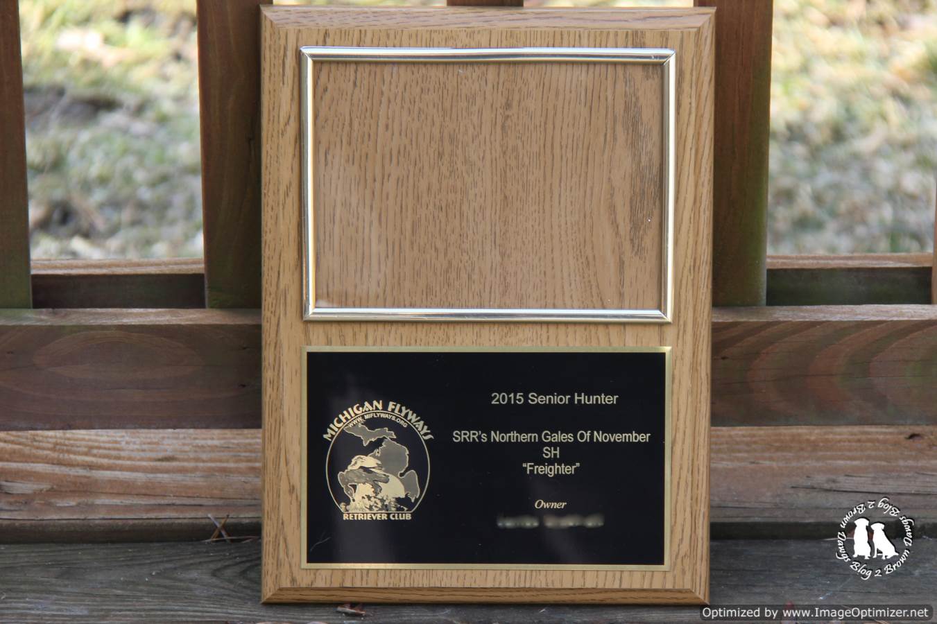 Each year our hunt test club awards plaques to dogs who have earned titles over the previous year. These plaques are awarded at the Annual Meeting which was a couple of weeks ago. Freighter was happy to receive his plaque for his Senior Hunter title. The blank area is for a photo which I still need to have printed.