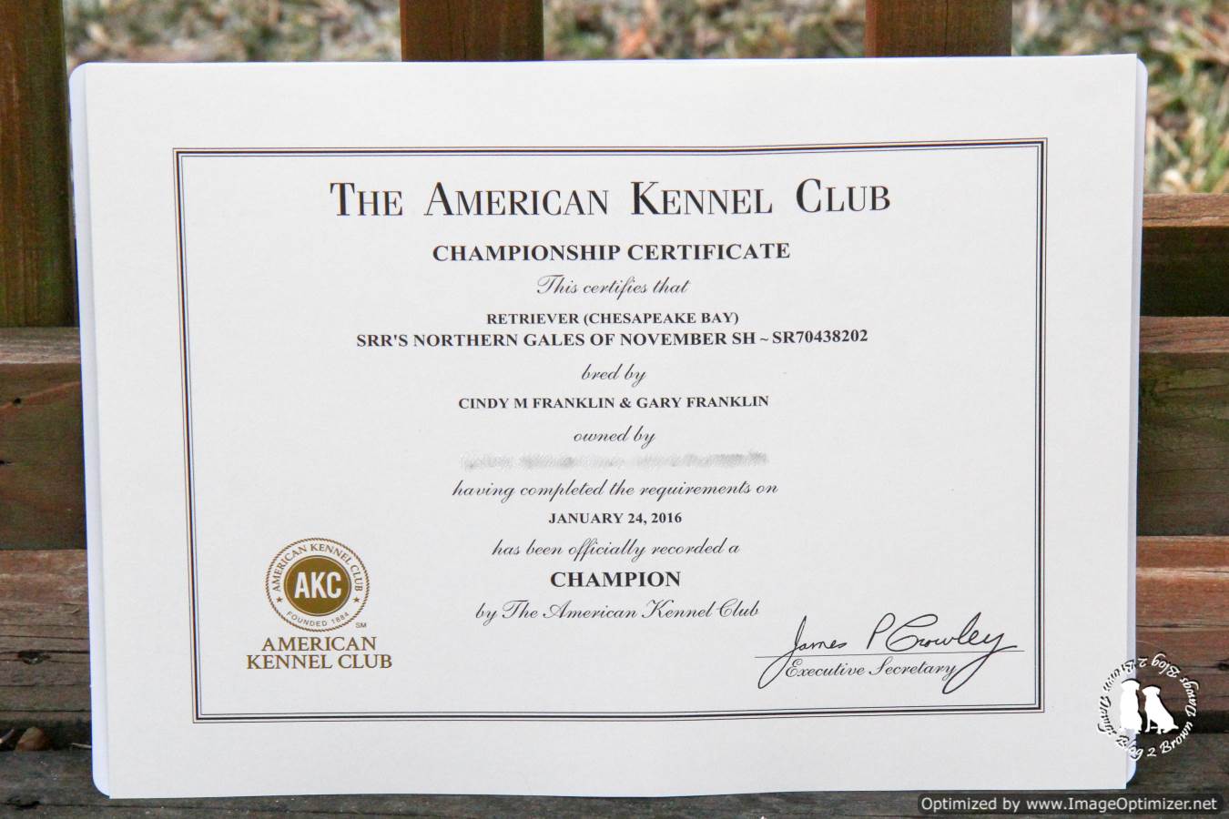 A week later Freighter received his official title certificate from the AKC for his show Championship. This is the AKC’s official acknowledgement of a title earned. We also received the printed copy of Freighter’s Championship photo. I still need to purchase frames for both.